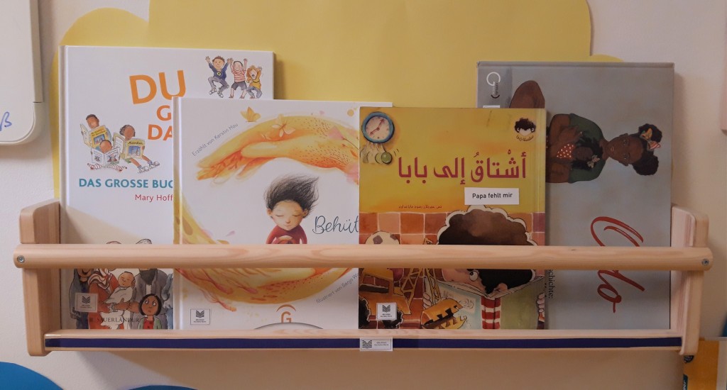 Hier befindet sich auch unsere Kita-Bibliothek, in der Kinder und unsere pädagogischen Fachkräfte Bücher ausleihen können. Derzeit entstehen außerdem Bücherrucksäcke, die von Familien für Zuhause ausgeliehen werden können.